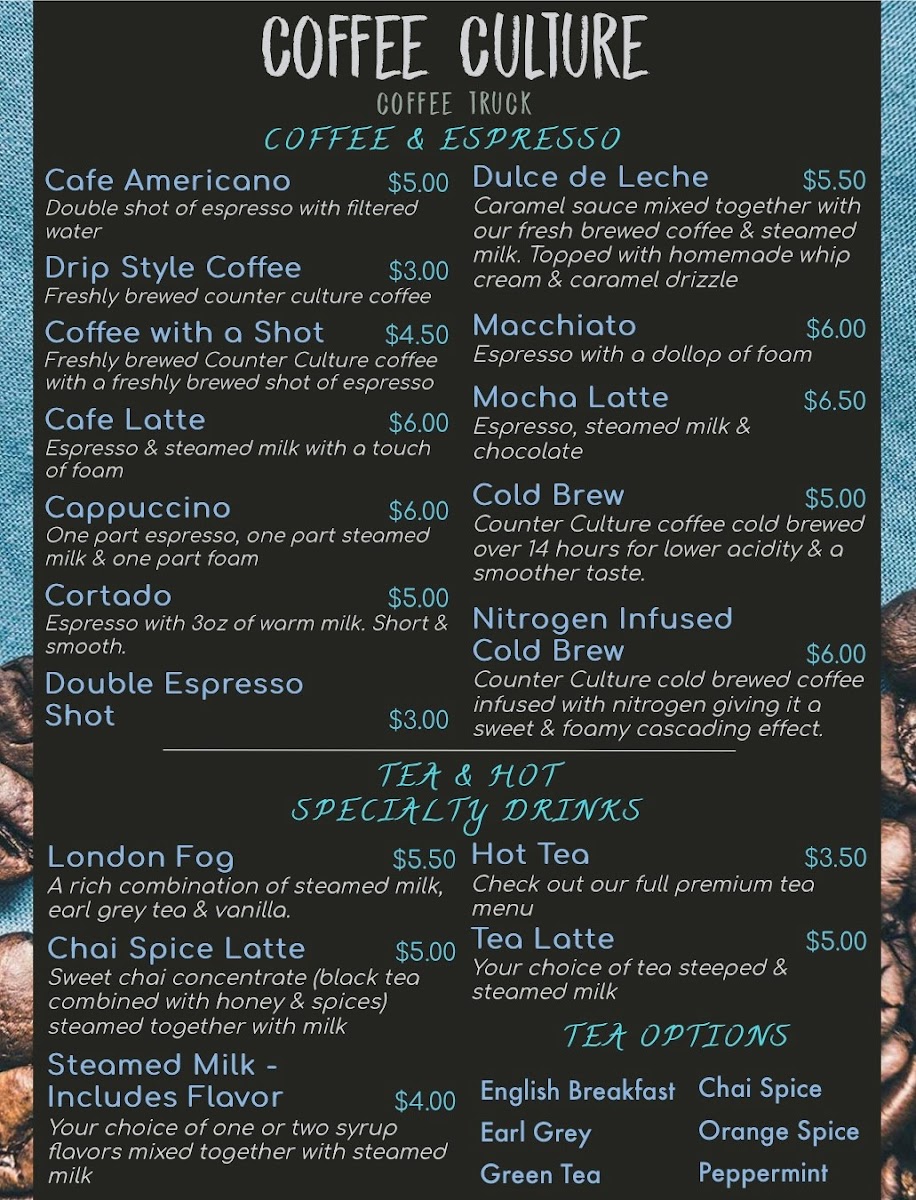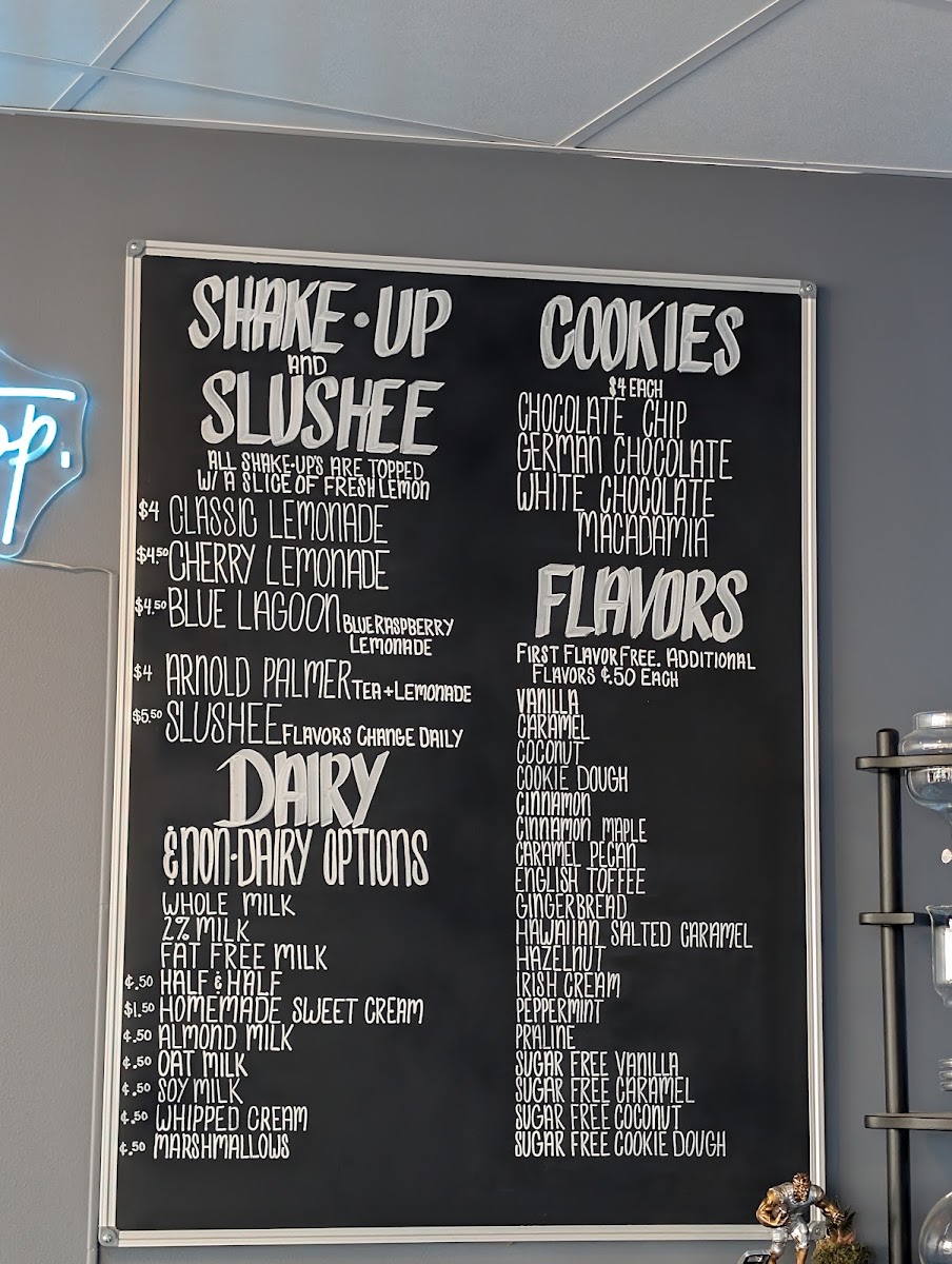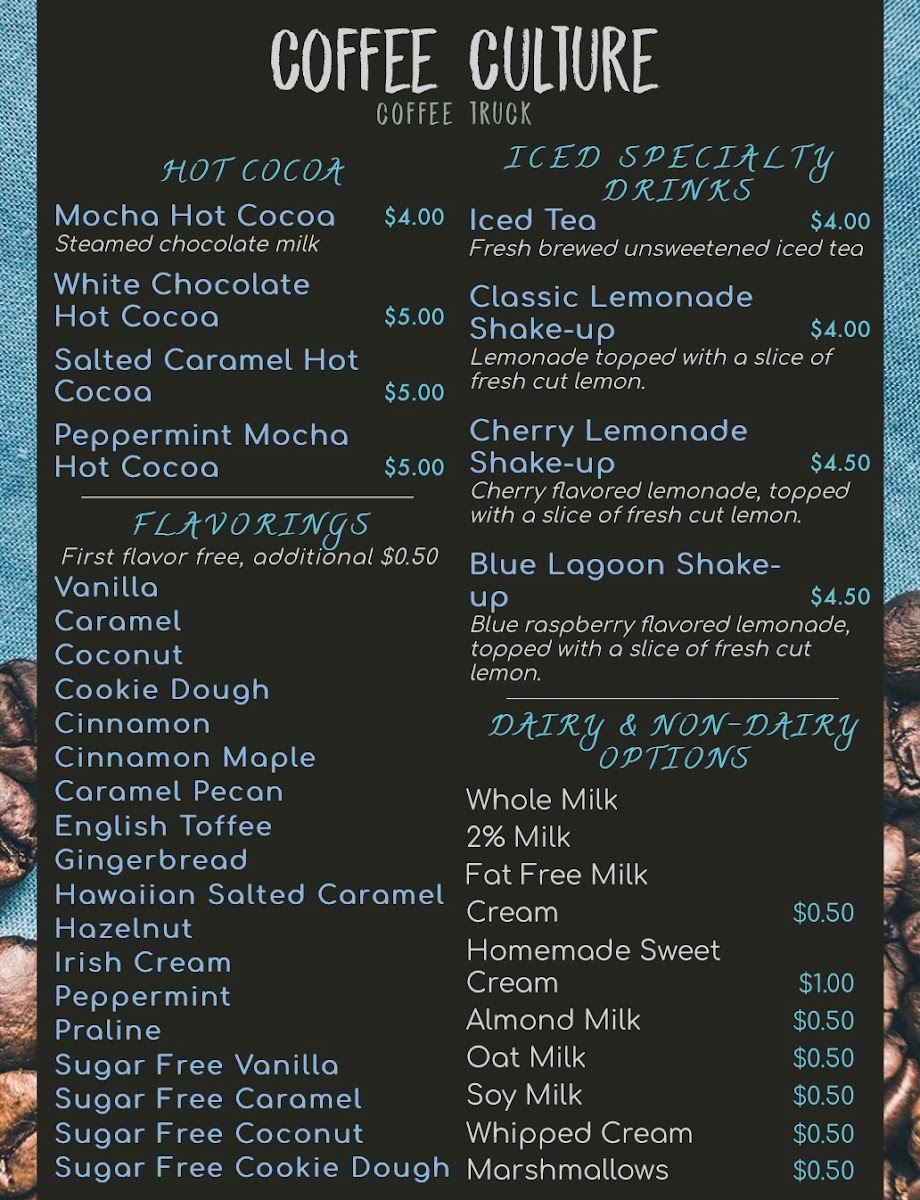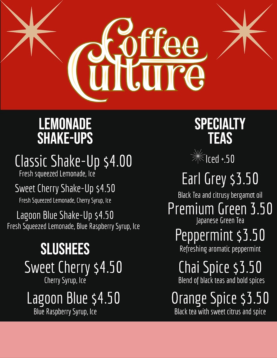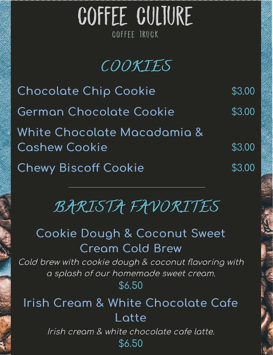 As a final takeaway, the menu at Coffee Culture / Cookie Hustle, located at 5532 S Lindbergh Blvd, St. Louis, MO 63123, leaves a strong and memorable impression, especially from the perspective of a reviewer who values both creativity and comfort. The Barista Favorites such as Cookie Dough & Coconut Sweet Cream Cold Brew and Irish Cream & White Chocolate Cafe Latte immediately set the tone with indulgent, dessert-inspired flavors that still respect the balance of quality coffee. The Cookies selection, including German Chocolate and White Chocolate Macadamia, is rich and satisfying, while the Others category expands the experience with treats like Orange Creamsicle, Chocolate Chip Cookie, German Chocolate Cookie, White Chocolate Macadamia & Cashew Cookie, and Chewy Biscoff Cookie, each offering a distinct texture and flavor profile. For purists, the Coffee & Espresso lineup-Cafe Americano, Drip Style Coffee, Coffee With A Shot, Cafe Latte, and Cappuccino-provides reliable classics done right. The Tea & Hot Specialty Drinks such as London Fog, Chai Spice Latte, Hot Tea, and Tea Latte add warmth and variety, while the indulgent Hot Cocoa options, including Mocha Hot Cocoa, White Chocolate Hot Cocoa, Salted Caramel Hot Cocoa, and Peppermint Mocha Hot Cocoa, cater perfectly to those craving something cozy and sweet. Customization is enhanced through Flavorings like Caramel, Coconut, Cookie Dough, Cinnamon, and Cinnamon Maple, allowing guests to personalize their drinks. On the refreshing side, Iced Specialty Drinks such as Iced Tea, Classic Lemonade Shake-Up, Cherry Lemonade Shake-Up, and Blue Lagoon Shake-Up pair well with the vibrant Lemonade Shake-Ups, including Classic Shake-Up, Sweet Cherry Shake-Up, and Lagoon Blue Shake-Up. The fun continues with Slushees like Sweet Cherry and Lagoon Blue, while Specialty Teas-Earl Grey, Premium Green, Peppermint, Chai Spice, and Orange Spice-round out the menu with aromatic depth. Altogether, the menu feels thoughtfully curated, approachable, and playful, making it a fitting conclusion that Coffee Culture / Cookie Hustle is not just a coffee stop, but a well-rounded destination for both classic and adventurous tastes.